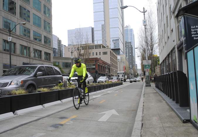 In September 2014, the Seattle Department of Transportation launched the Second Avenue protected bike lane pilot project. As a pilot project, a two-lane cycle track was constructed on the southbound side of Second Avenue with paint and plastic posts. The purpose of pilot bike lane projects, like this, are to design and implement demonstration projects that illustrate to the public how new types of infrastructure-bike lanes-could work in the real world, particular how new types of infrastructure could work on real roads. The demonstration worked. “If you look at the bike volumes, before there were about 188 folks a day who would ride down Second," Dawn Schellenberg, the SDOT project developer in charge of the plan said, according to one source. "If you make it a two-way bike ...