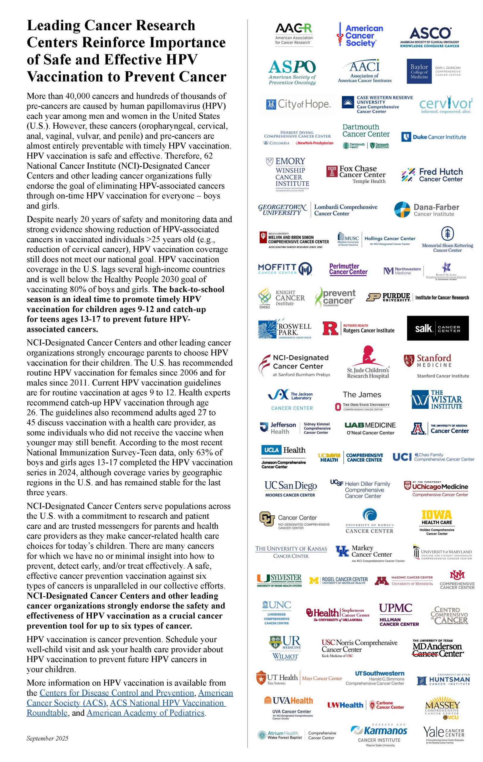 Sixty-two NCI-Designated Cancer Centers with leading national organizations and the University of Puerto Rico Comprehensive Cancer Center endorse this statement and share the goal of sending a powerful message about the importance of HPV vaccination for the prevention of HPV-related cancers. HPV vaccination is safe, effective, and provides long-lasting protection against HPV-related cancers and other conditions associated with HPV.